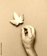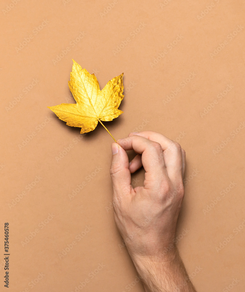 Male hands hold golden autumn leaves on brown beige background top view copy space. Autumn minimalistic concept, Fall. Autumn background. Minimal floral design, Autumn composition. Golden twig