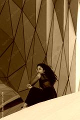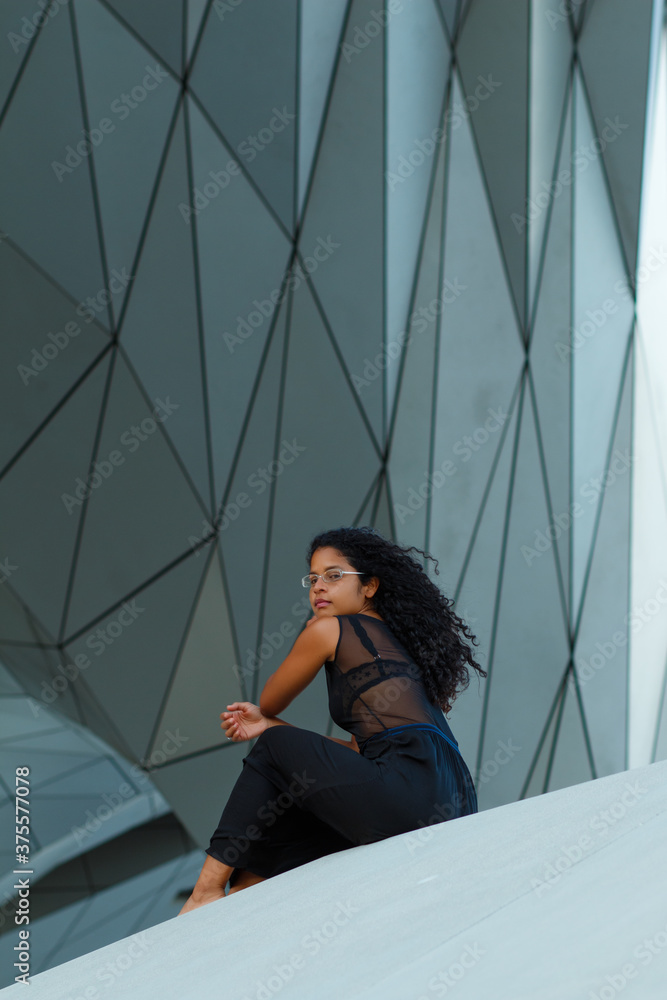 Vertical shot of a curly brunette Hispanic female an elegant black dress