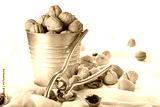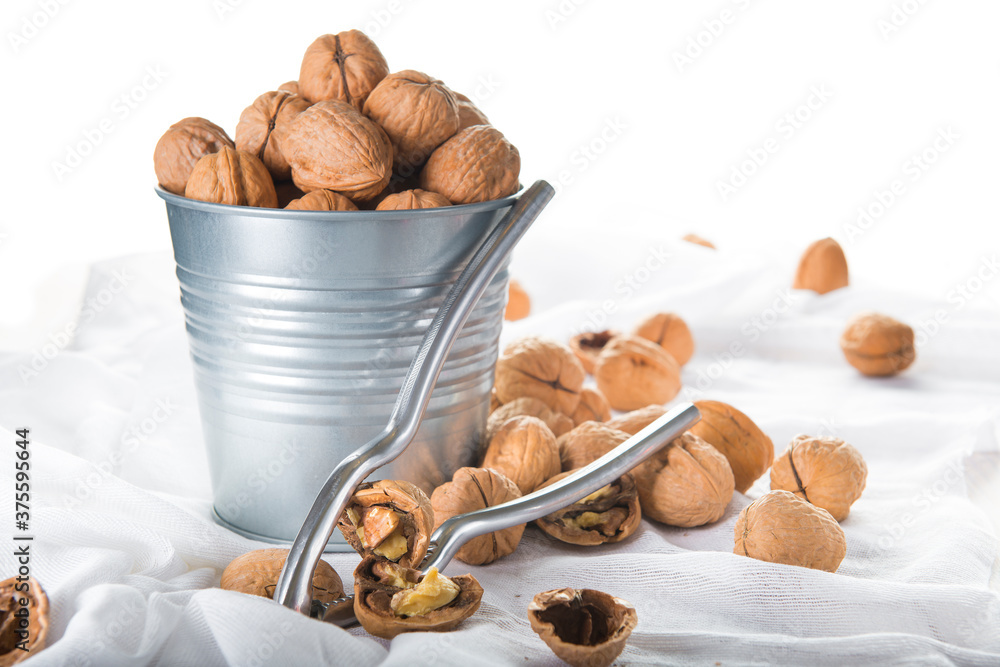 Bucket full of walnuts with a nutcracker on a white background
