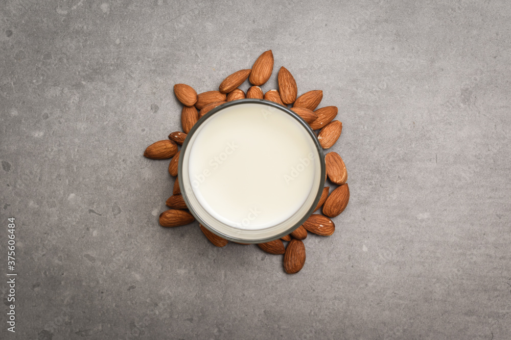 Almond milk in a glass with almond ingredients on table