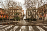 Beautiful rainy street of Rome with people under umbrella silhouettes for lifestyle design. Summer season. Dark and moody background. Beautiful romantic background. Tourism concept.