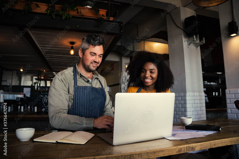 Male and mixed race female coffee shop owners smiling at laptop in coffee shop.