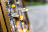 Macro closeup of hanging yellow orange light bulbs isolated closeup with bokeh blurry background and copy space in Warsaw, Poland Christmas holiday