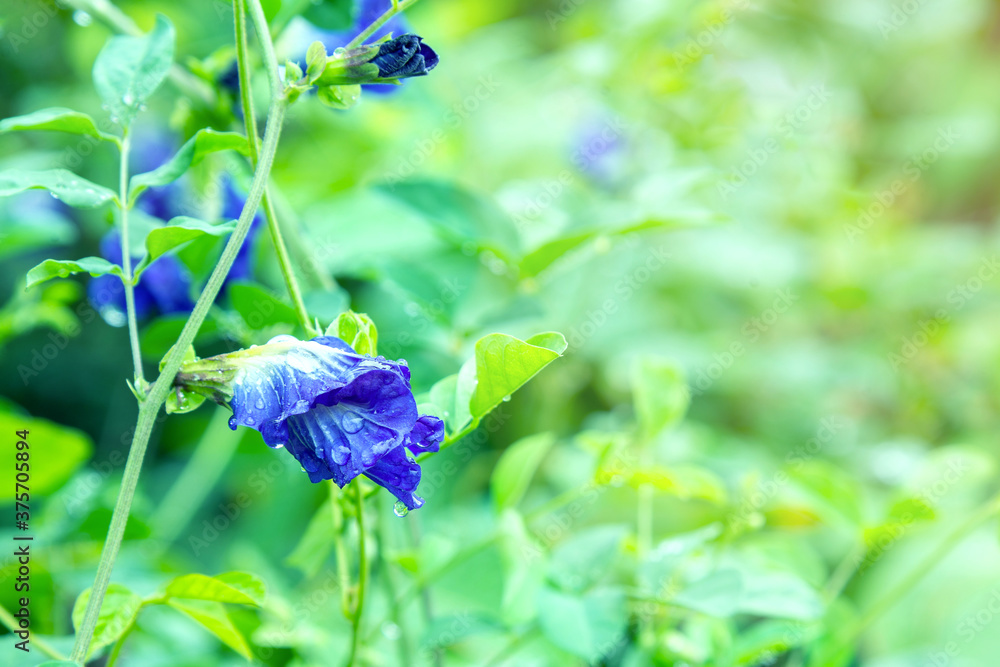 Blue Pea flower or Butterfly Pea flower (Clitoria ternatea) blooming on the vine with water drops and orange light in the morning. Selective focus.