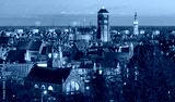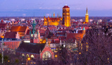 Aerial view of the Saint Mary Church and City Hall at night in Gdansk, Poland