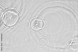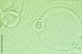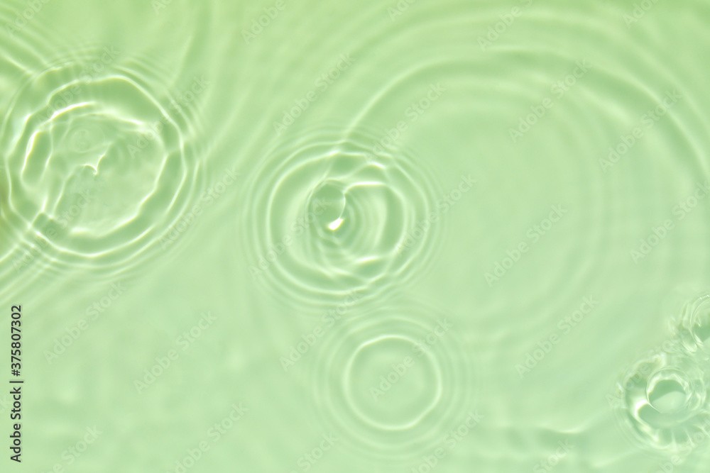 Closeup of mint green transparent clear calm water surface texture with splashes and bubbles. Trendy abstract summer nature background. Mint colored waves in sunlight. Copy space.