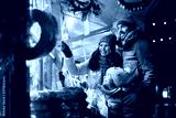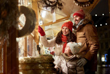 family, winter holidays and celebration concept - happy mother, father and little daughter at christmas market on town hall square in tallinn, estonia