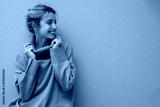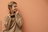 Beautiful young woman wearing knitted sweater on light brown background. Space for text