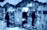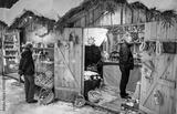 Romantic Christmas market with illuminated shops in wooden huts with gifts and handmade decoration.