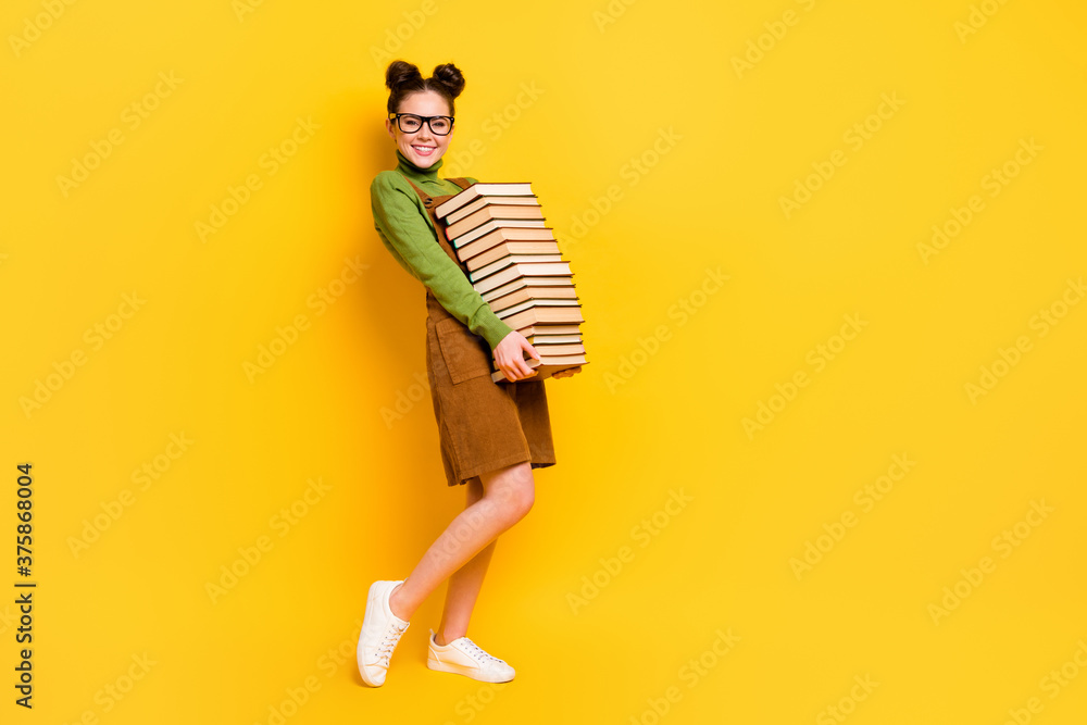 Full length body size profile side view of her she attractive cheerful cheery strong knowledgeable girl carrying book delivery isolated bright vivid shine vibrant yellow color background
