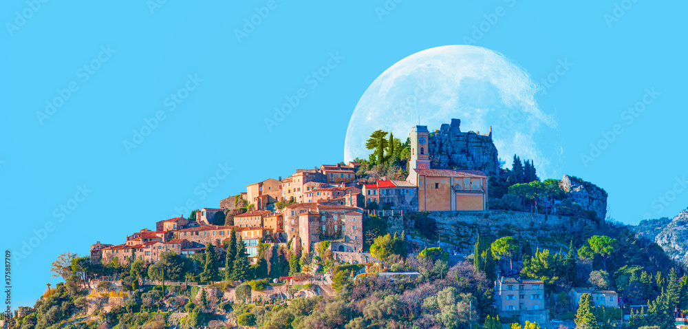 Eze village is a famous tourist destination on French Riviera, full moon in the background - Nice, France "Elements of this image furnished by NASA"