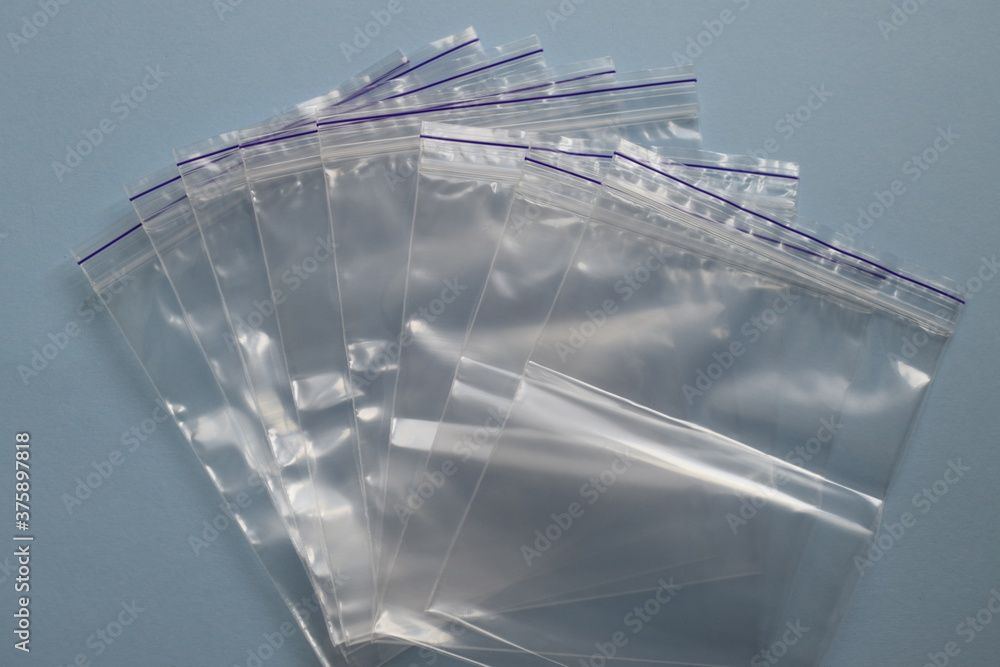 A lot of small disposable plastic bags with zip fastener on a plue background. View from above.