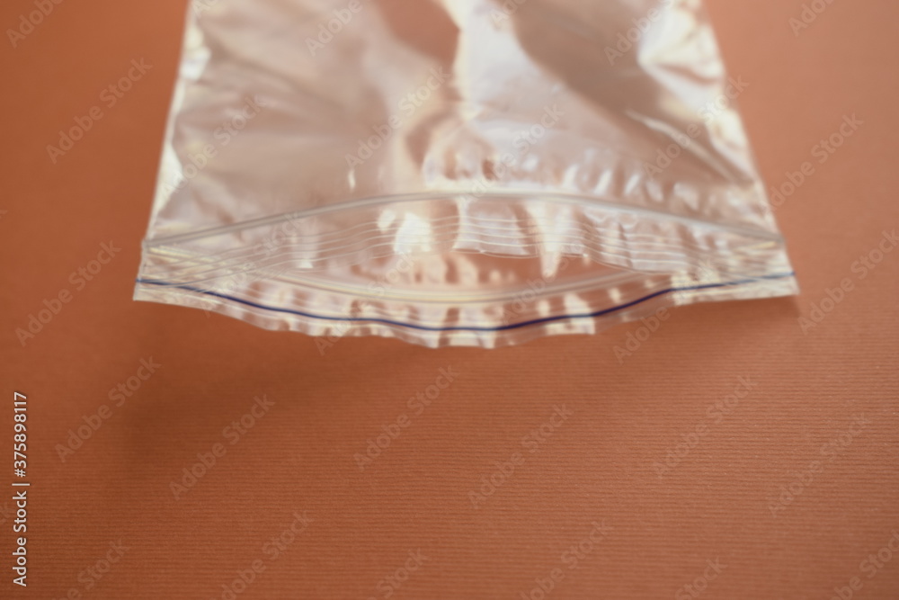 Small transparent plastic bag with zip clasp on a brown-yellow background. The clasp is open.