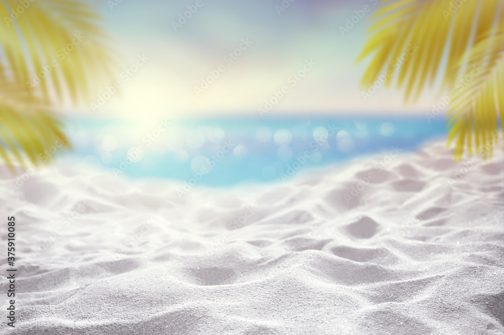 Summer time with White Sand dunes with tropical blurry sea sky background with Palm leaves as frame Summer vacation concept