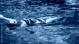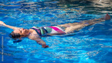 Woman floating relaxed in a swimming pool with crystal clear water, sunny day in Puerto Vallarta, Jalisco, Mexico