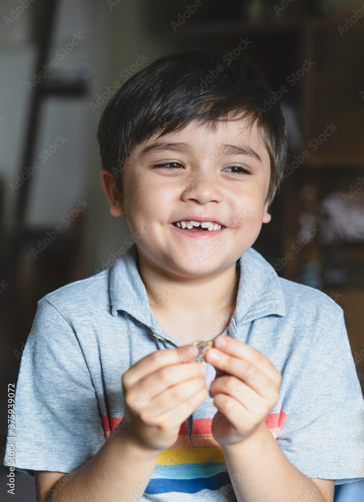 Portrait happy kid looking out with smiling face, Child playing alone in living room, Candid shot cute young boy relaxing stay at home during covid lock down. Positive children concept