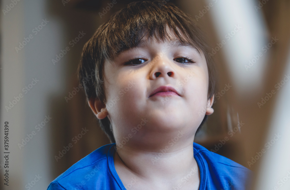 Head shot Kid making funny face while looking at camera with blurry background, Candid shot child boy smiling face relaxing at home on weekend, positive children concept