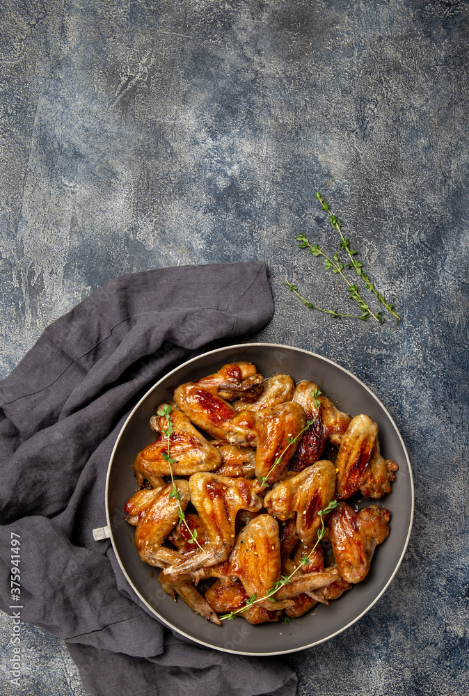 Roasted chicken wings in sweet sauce. Top view copy space