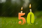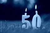 Figure 50 candles with fire on the green grass, birthday anniversary
