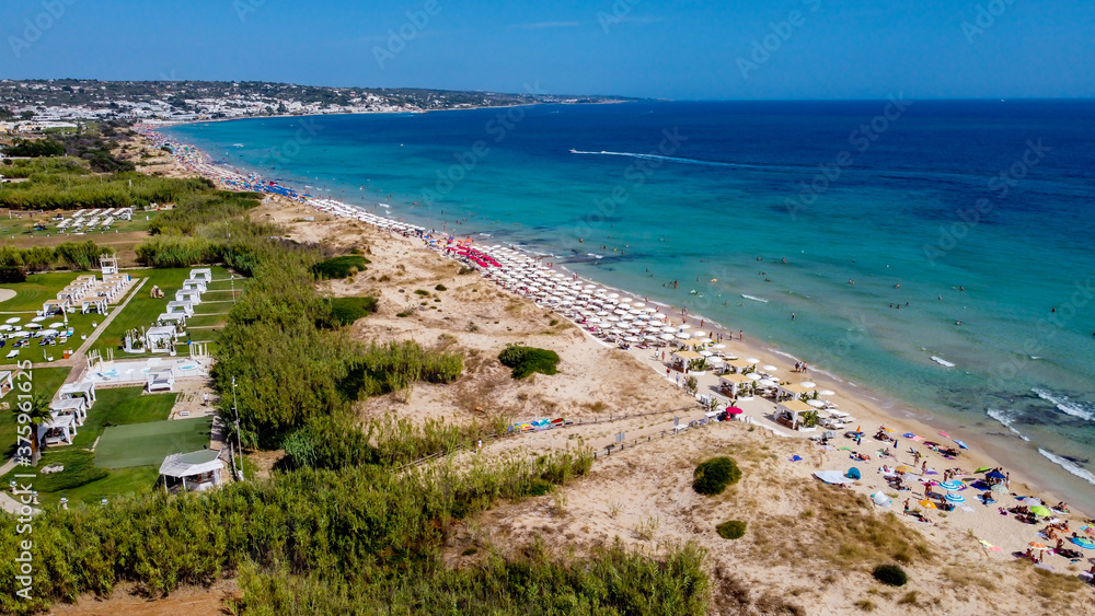 Aerial view of the Pescoluse Beach, aka Maldives of Salento, in the south of Italy - Apulian beach with turquoise waters in summer - Idyllic holiday destination along the Ionian Sea