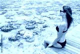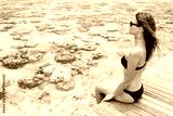 Young pretty woman in black bikini sitting alone on the pier near the sea