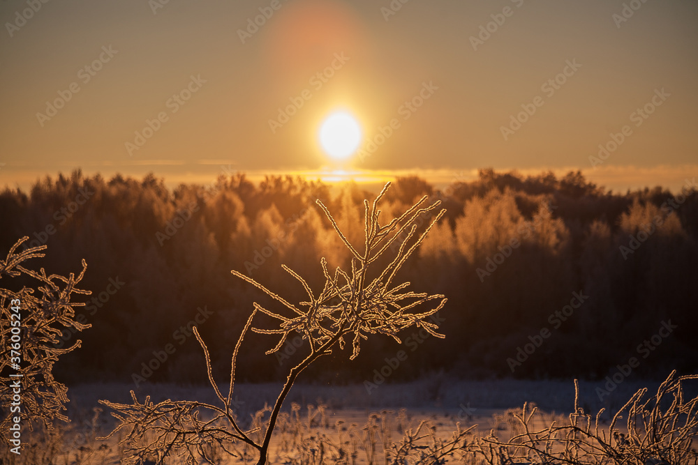 Trees in the snow on the background of the rising sun.Winter forest landscape.snow-covered trees.Morning frost.Dawn in winter