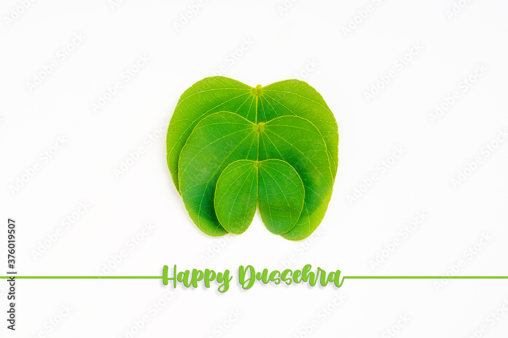 Happy Dussehra greeting card , green apta leaf and rice, Indian festival dussehra