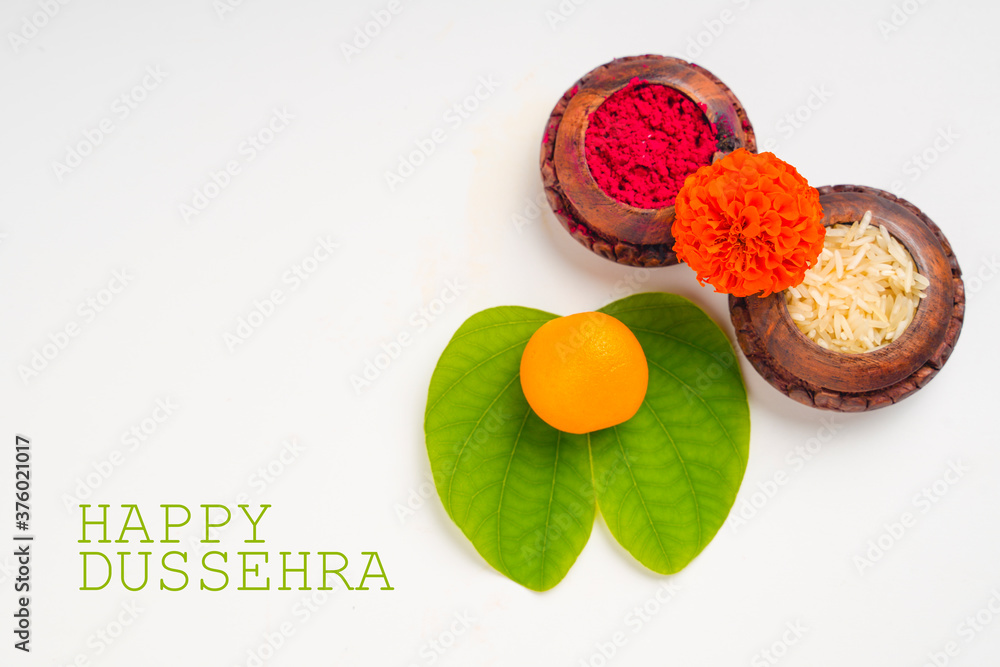 Happy Dussehra greeting card , green apta leaf and rice, Indian festival dussehra
