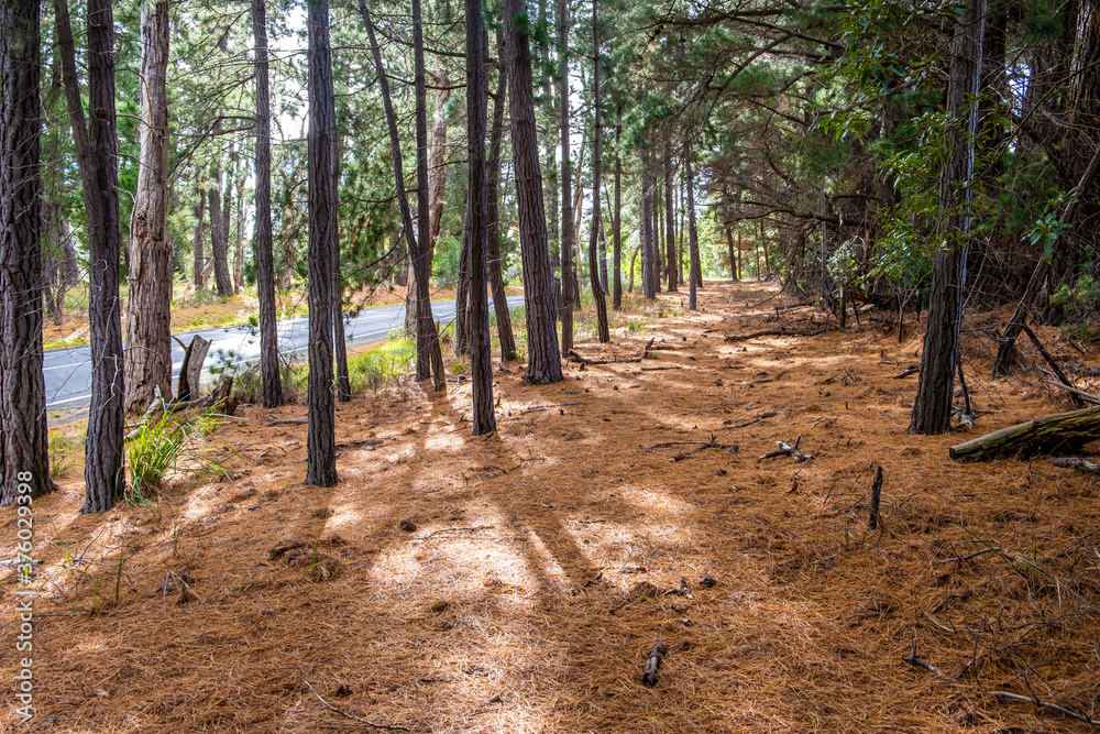 Walking path covered with fir needles near rural road among conifer trees