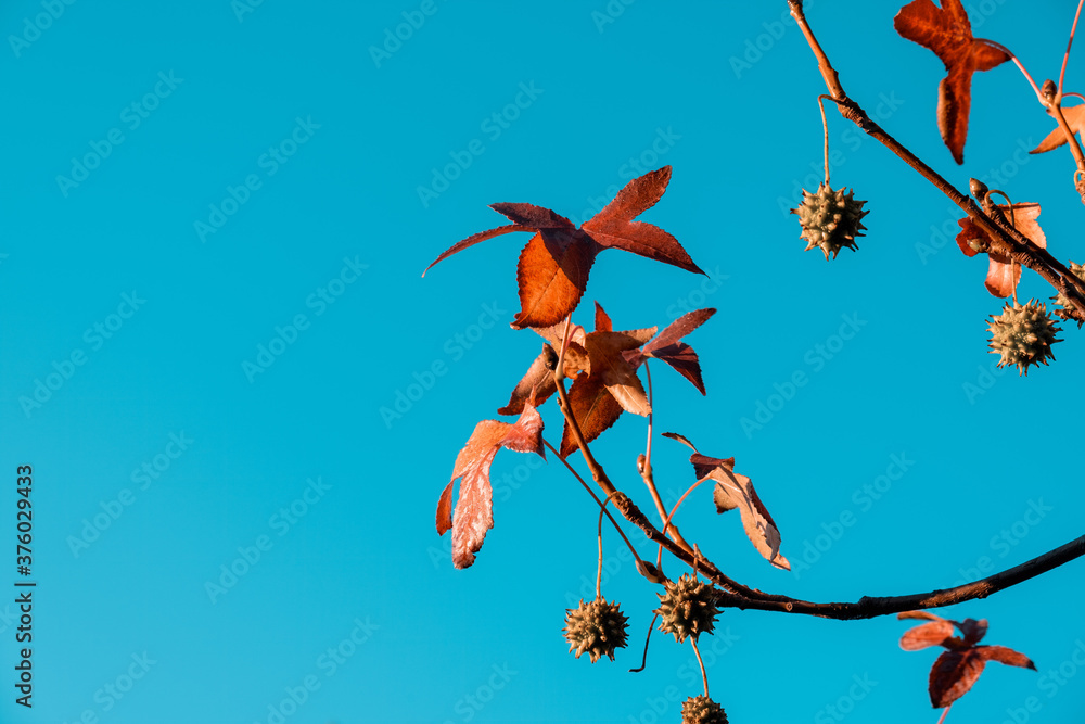 Beautiful orange autumn leafs on branches against clear sky with copy space