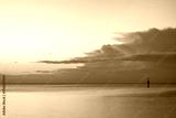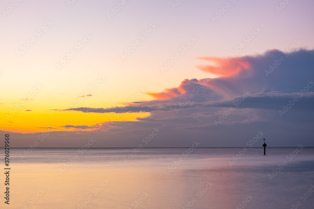 Nothing but skies and silky smooth water at glowing ocean sunset with copy space