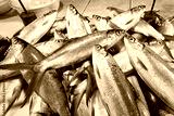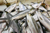 Isolated close-up of a heap of silver colored fresh bangus milk fish for sale at the Central Market in Iloilo City, Philippines