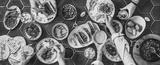 Friends home taco party. Flat-lay of Mexican traditional dishes Tacos with beef meat, corn tortillas , tomato salsa and peoples hands with food over green background, top view. Mexican cuisine