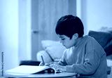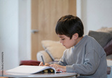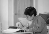 Portrait of school kid boy siting on table doing homework, Child holding pencil writing, A boy drawing on white paper on table, Elementary school and homeschooling concept