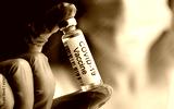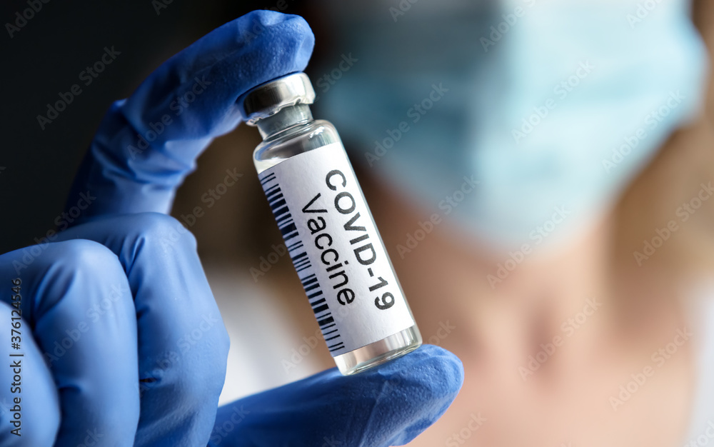 Doctor holds bottle with COVID-19 vaccine in laboratory.