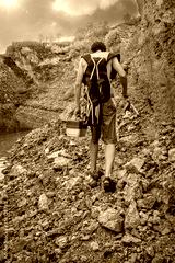 Teen boy walking with fishing equiment including pole and tackle box on rocks at lake,pole,fishing pole