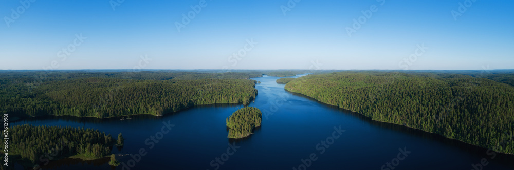 Aerial panoramic view of huge lake with islands. Land of thousands lakes surrounded by forests. Summer in Finland.