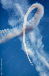 Jet airplanes trailing smoke during an airshow against a blue sky