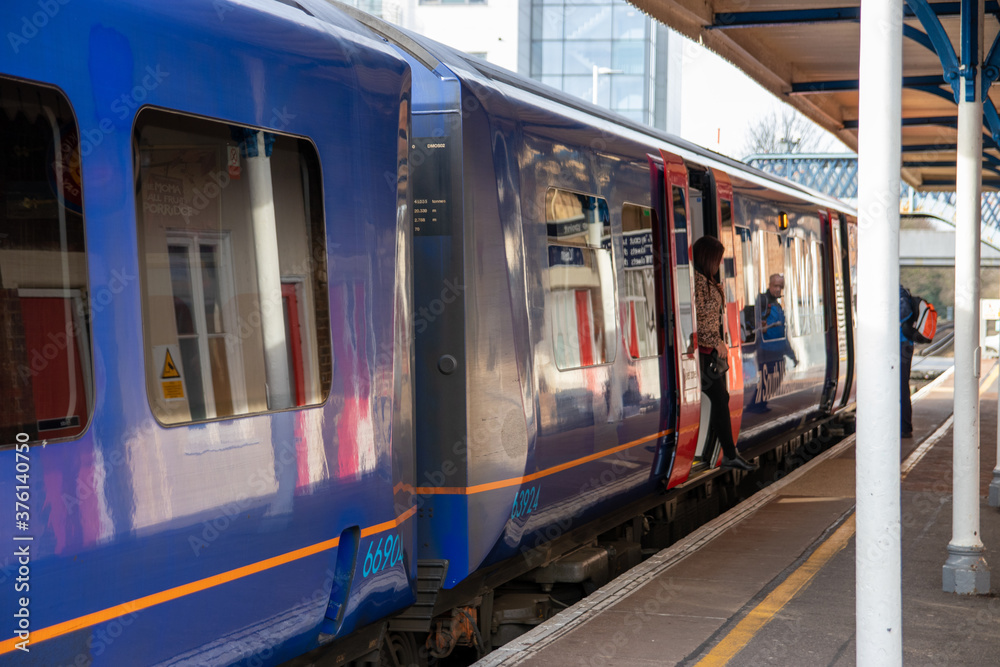 train Passengers or commuters leaving a train stepping onto a platform