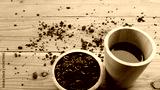 coffee beans and cup on the wooden background.