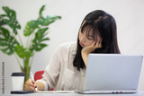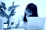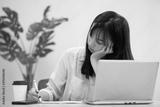 頬杖をついてメモをとる女性