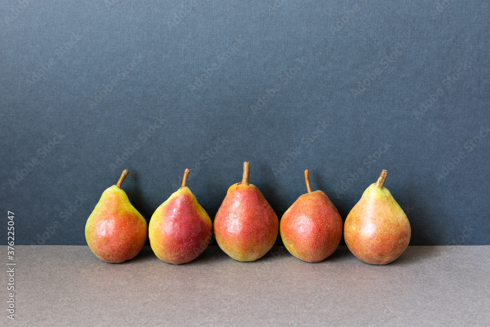 Still life composed of five yellow red pears. Harvest ripe natural organic fruits on a two-tone background. copy space for text Creative design farmers food and market advertising poster.