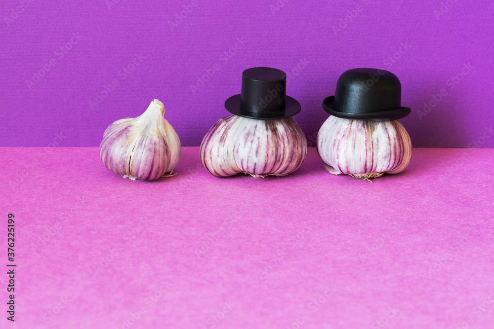 Garlic family characters on violet purple background. Funny vegetables with black old fashioned hats. Creative design farmers food market advertising poster. copy space
