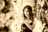 A dark-haired young girl poses in beautiful lingerie and a light black and pink shirt. The interior is decorated for the Christmas holidays. Stunning brown hair in linen