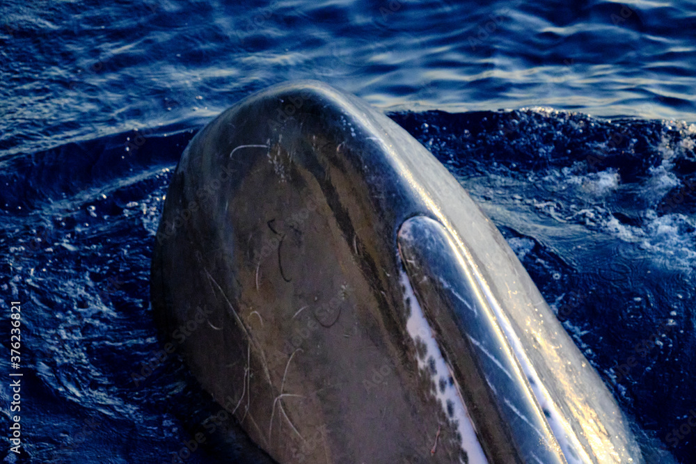 Very friendly sperm whale in Ligurian sea, in front of Genoa, Italy. Jaw