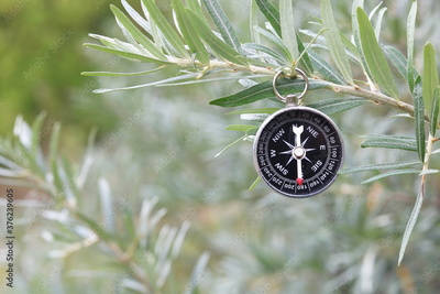 round compass on tree branch as symbol of tourism with compass, travel with compass and outdoor activities with compass