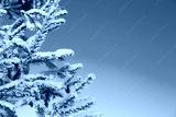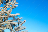 Tops and crowns of fir trees covered with snow against the blue sky, frozen spruce in the forest sky background