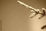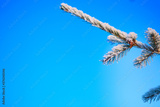 Tops and crowns of fir trees covered with snow against the blue sky, frozen spruce in the forest sky background