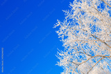 Birches in winter frozen by snow and ice rain with astonishing blue sky behind its treetops