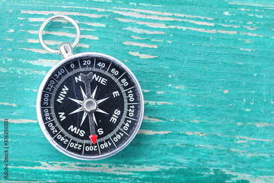 Classic round compass on green wooden vintage background as symbol of tourism with compass, travel with compass and outdoor activities with compass